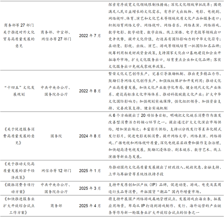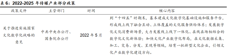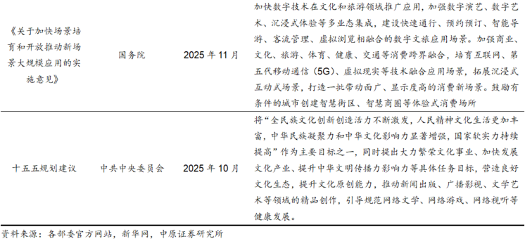 2022年后,传媒板块面临的政策变量边际改善,在走出了行业监管政策底之后,政策主线从“强调监管”转向“推动产业高质量发展”。包括《关于促进服务消费高质量发展的意见》《提振消费专项行动方案》《关于推动文化高质量发展的若干经济政策》《加快推进服务业扩大开放综合试点工作方案》《关于加快场景培育和开放推动新场景大规模应用的实施意见》以及十五五规划建议等重要政策文件都针对国内文化产业提供了新的发展思路。