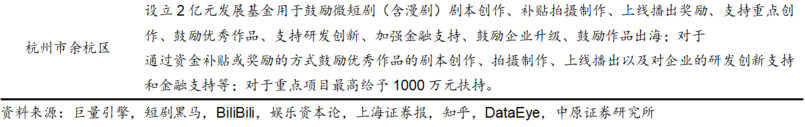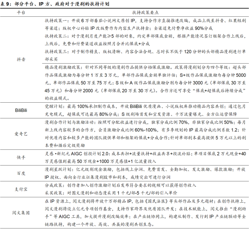 目前漫剧享受平台、版权方、政府的多方政策共振,包括抖音、BiliBili、爱奇艺等平台给予包括直接采买、高额分成、保底激励、流量补贴等各类扶持政策;同时阅文等IP持有方也针对漫剧开放IP授权,鼓励IP改编;政府端对于优质的漫剧项目也提供了资金和企业扶持。预计各方的政策共振以及对于精品漫剧的扶持导向将持续推动漫剧市场的高速增长。
