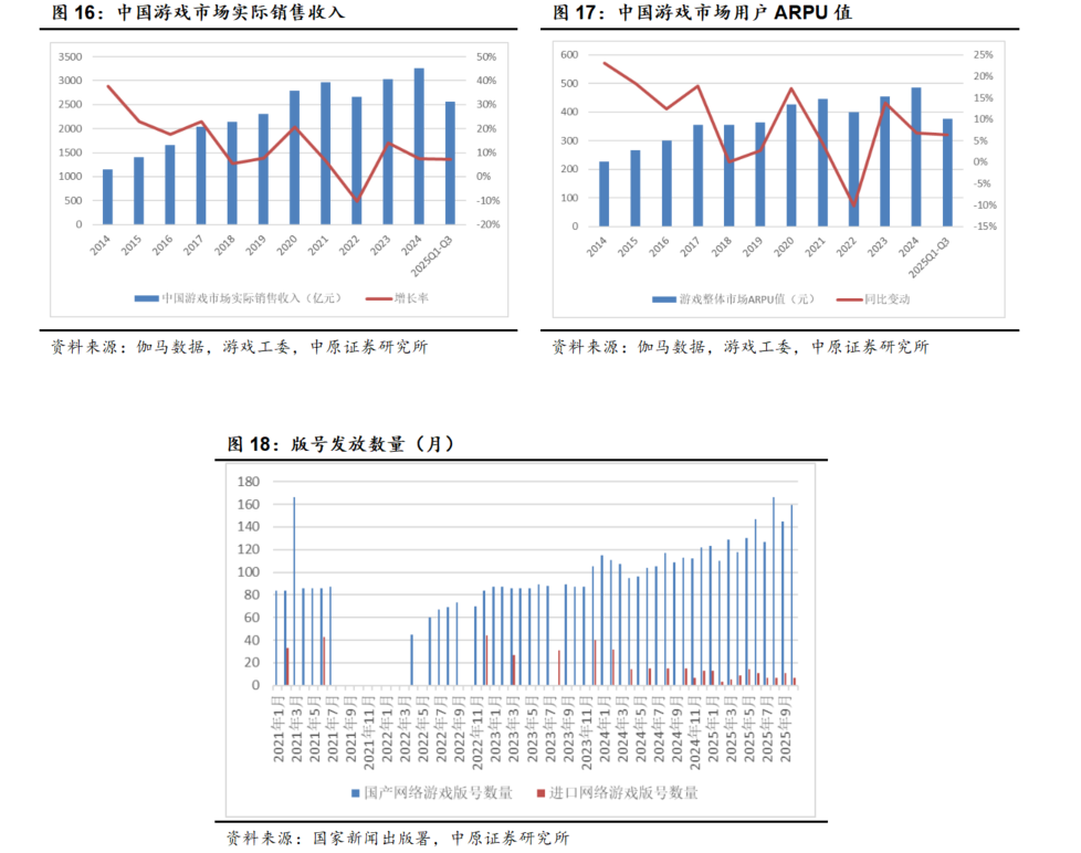 游戏行业目前供需两旺。在供给端,根据国家新闻出版署的公示,2024年全年发放国产+进口游戏版号1417款,2025年1-10月发放国产+进口游戏版号1441款,超过2024年全年发放数量,并且单月发放的数量呈现上行趋势。供给端的改善为行业带来了更多新产品,驱动国内玩家在需求端对于游戏时间以及充值消费意愿不断提高,用户ARPU值的持续提升,产业保持较高的景气度。