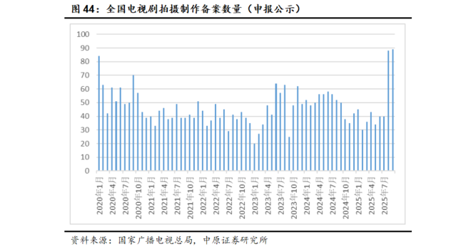 根据广电总局披露数据,2025年8月“广电21条”发布后,8月和9月全国电视剧拍摄制作备案数量有了明显的增加,单月制作备案数量接近90部,达到2020年以来的最高值,预计2026年影视剧产业内容供给有望迎来明显的改善。