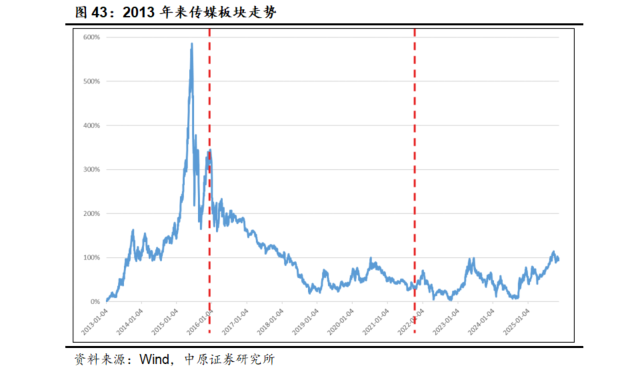2013-2015年,由于智能手机、4G、移动互联网等硬件设备的普及催生了游戏、在线视频、数字阅读、在线购物、网路直播等产业的快速扩张,加上这一阶段国家对于内容产业的政策扶持以及外部货币政策和股市并购重组活跃下共同推动A股市场的火热,传媒板块也迎来出了大幅度的上涨,从2013年初计算,传媒指数最高涨幅达到近600%。