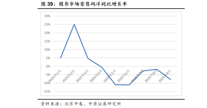 根据开卷数据,2025年前三季度图书零售市场呈现负增长,码洋同比下降1.24%,实洋同比下降2.60%。分阶段来看,2025Q1图书零售市场受技术热点和爆款影视带动,出现较高的同比增长;但Q2和Q3均处于同比负增长。图书零售市场的下滑和大众消费态度有关,在面临不确定情况下,消费者的购买决策更加谨慎。
