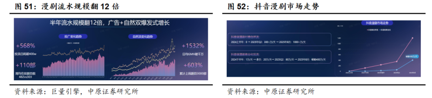 漫剧市场当前处于快速增长阶段,景气度高。根据巨量引擎的数据,2025H1漫剧数量月复合增速达到83%以上,播放量月复合增速92%以上,点赞量月复合增速105%以上,抖音端漫剧付费自然流从2024H1的0增长至2025年8月的1000万元以上/天,商业化投流从2024H2的1万元/天提升至2025年8月的400万/天。近半年漫剧累计上线剧目3000部,增长603%,日均GMV破千万,流水规模翻12倍。