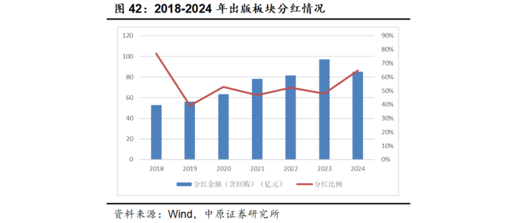 2024年出版板块的年度累计分红总额85.25亿元,同比减少12.20%。以2024年131.35亿元归母净利润计算,分红比例为64.90%,yoy+16.82pct,分红比例达到2019年以来的最高水平。31家公司中有3家公司分红比例在80%以上,8家公司分红比例在60%-80%之间,分红比例高于50%的公司数量占比58.06%。