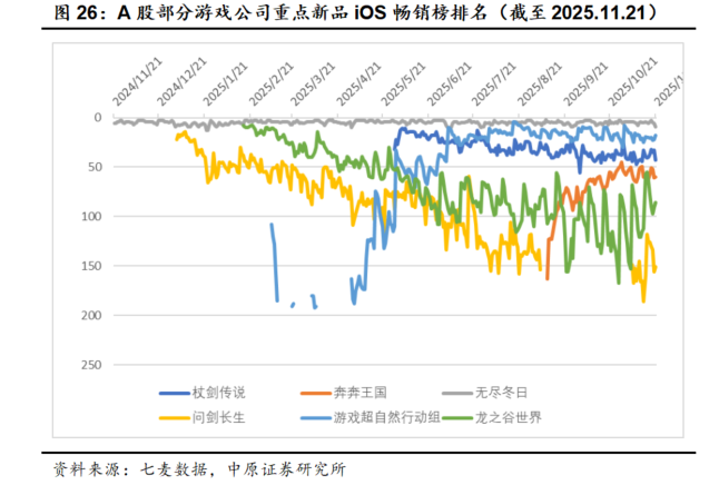 2024-2025年A股多家游戏公司新品均有优异表现。例如世纪华通《无尽冬日》《奔奔王国》以及海外版本《Whiteout Survival》《Kingshot》、巨人网络《超自然行动组》、吉比特《杖剑传说》《问剑长生》等产品在iOS畅销榜居于前列,提振相关公司业绩。考虑到游戏行业整体的长线化趋势,预计2025年新上线的爆款产品将持续为公司提供稳定的业绩支撑。