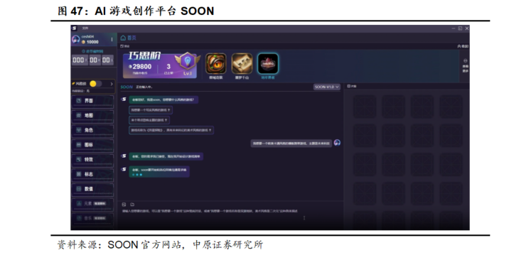 以AI游戏研发工具为例,恺英网络旗下一站式AI游戏创作平台SOON凭借多模态大模型的能力,实现了从美术资产、程序代码部署全流程的全自动化操作,包括角色、场景、动画制作、数值参数、代码系统都能够通过AI实现全自动生成,极大的缩短了游戏的开发周期。