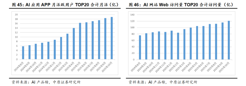 截至2025年10月,AI应用App月活TOP20合计月活规模18.93亿,环比增加2.44%,AI网页Web访问量TOP20合计访问量121.20亿,环比增加4.70%。在AI应用App月活排名中,ChatGPT、豆包、夸克排名前三,月活跃用户规模分别为7.69亿、1.59亿、1.52亿,AI网页Web访问量排名中,ChatGPT、New Bing、Gemini排名前三,分别为63.7亿、13.7亿和12.2亿。
