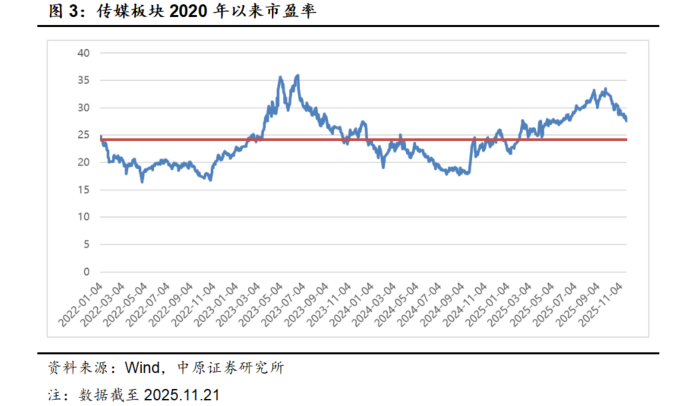 从估值角度来看,截至2025年11月21日,传媒板块的PE(TTM,剔除负值)27.64倍,2022年以来传媒板块的平均PE为24.19倍,中位数为23.53倍,当前估值历史分位数75.70%。