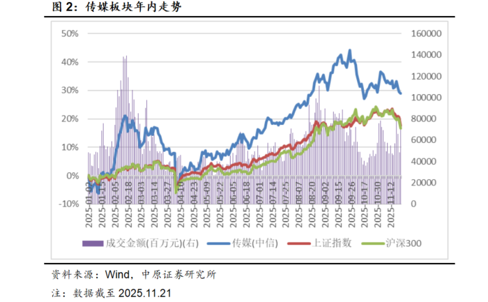 截至11月21日,2025年中信传媒指数上涨26.42%,跑赢沪深300(+13.18%)13.24pct,跑赢上证指数(+14.41%)12.01pct,跑输创业板指(36.35%)9.93pct。从涨跌幅排名来看,传媒板块在31个行业分类中排在第7位。
