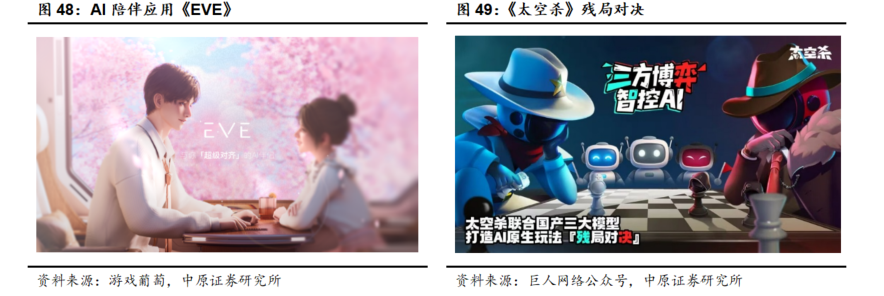 在运营层面,AI可以生成图片/视频等推广素材,并对投放策略进行优化,提升玩家的转化;在用户数据侧针对玩家的行为进行分析,改进游戏体验,提升玩家的留存和付费率,延长游戏产品生命周期;在客户服务方面,通过智能客服功能可以提高响应效率和客户满意度,防止玩家流失;在多人游戏模式下,可以利用AI强化玩家匹配机制、识别外挂、作弊软件和网络欺诈等,提升玩家游戏体验和安全感。目前多家游戏上市公司已经建立内部AI中台,用于玩家数据分析、AI智能客服、投放策略优化等。
