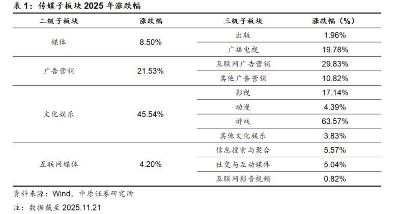 在子板块和重点公司中:(1)游戏板块基本面改善以及产品周期兑现带来高景气度,行业供需两旺,AI技术加速渗透带来的研发、运营等效率的降本增效在报表端逐步验证,基于AI技术特点带来的玩法创新与交互体验变革正在部分产品中得到验证,建议关注吉比特、恺英网络、三七互娱、完美世界;(2)影视板块虽然面临电影市场票房波动的影响,但部分影视公司已经向IP运营方向进行转型探索,提高内容IP长期价值,降低内容的短期波动影响,叠加当前IP消费市场的高景气,有望改善当前影视板块的营收结构,保持市场估值稳定性,此外,在“广电21条”的政策扶持下,长剧领域有望迎来向上拐点,AI漫剧赛道正处于快速增长阶段,在AI技术和平台政策的双重共振下有望继续维持,建议关注光线传媒、万达电影、芒果超媒;(3)广告板块建议关注分众传媒,收购新潮传媒事项推进中,行业竞争格局优化有望提高公司对上下游的议价能力,同时新潮传媒原有点位也能与公司形成有效互补,此外,与支付宝“碰一碰”功能的合作实现广告场景交互模式的创新,提高公司广告点位价值;(4)防御性配置层面,国有出版公司具有低估值+高分红带来的高股息特点,建议关注中原传媒。