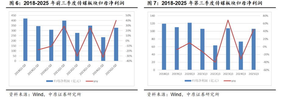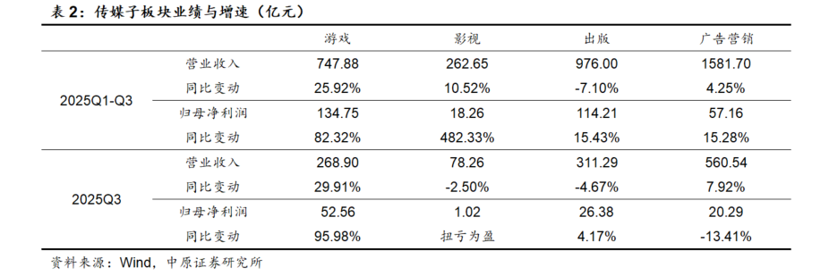 各子板块的业绩分化较为明显。游戏板块市场景气度高,基本面优异,多家A股游戏公司进入新品周期且新品的流水表现优异,带动游戏板块整体业绩的大幅提升。影视板块前三季度业绩增长较为显著,但受内容周期等原因,Q1和Q3业绩增长较好,Q2业绩下滑;出版板块利润端受所得税政策影响的延续增加比较明显,但教辅征订方式变化以及大众图书市场需求变化对营收、营业利润依然造成影响;广告营销板块前三季度业绩增长较为稳健,第三季度的利润下滑主要是受个股持有的各类股票、基金公允价值变动较大的影响,假设剔除该个股影响,2025Q3广告营销板块归母净利润同比增长9.07%。