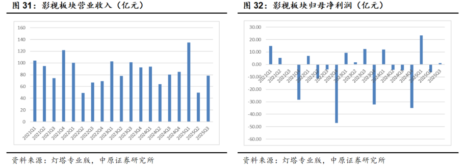 国内电影市场票房的波动对A股影视板块的业绩也有比较明显的影响。2025Q1-Q3营业收入分别为135.00亿元、49.39亿元、78.26亿元,同比分别变动+44.18%、-22.53%、-2.50%,归母净利润分别为23.43亿元、-6.09亿元、1.02亿元。其中光线传媒依靠电影《哪吒2》在2025Q1实现归母净利润20.16亿元,占影视板块整体归母净利润的86.04%。