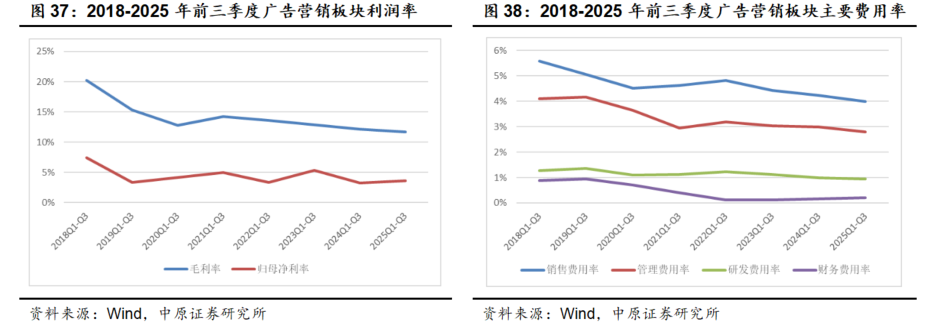 2025年前三季度广告营销板块毛利率11.74%,同比下滑0.44pct,第三季度毛利率11.71%,同比下滑0.10pct。虽然广告营销板块整体的收入实现增长并创新高,但市场竞争压力下广告营销公司的毛利率面临增长瓶颈,呈现出持续下滑的态势。