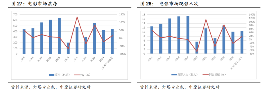 2025年1-10月国内电影市场票房445.64亿元,同比增加16.07%,观影人次10.57亿,同比增加16.65%。虽然2025年1-10月的票房和观影人次数据均已超过2024年全年,但受档期因素和爆款内容不稳定的影响,票房存在比较严重的分布不均。例如2025Q1由于春节档影片《哪吒2》的票房爆发,整体的票房同比增长47.94%;但Q2影片内容匮乏,票房同比减少34.71%;Q3暑期档催动下票房再次恢复至同比增长17.06%;10月国庆档低于预期,票房又回落至同比减少27.94%。