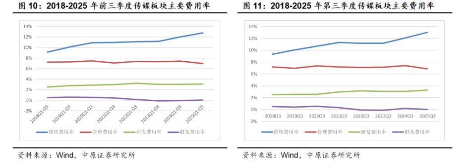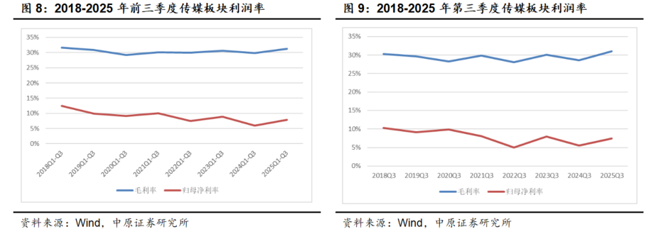 传媒板块整体盈利能力有所提升。2025年前三季度传媒板块的整体毛利率31.27%,同比提升1.42pct,归母净利率7.91%,同比提升1.99pct;2025Q3单季度整体毛利率31.05%,同比提升2.50pct,归母净利率7.42%,同比提升1.87pct。