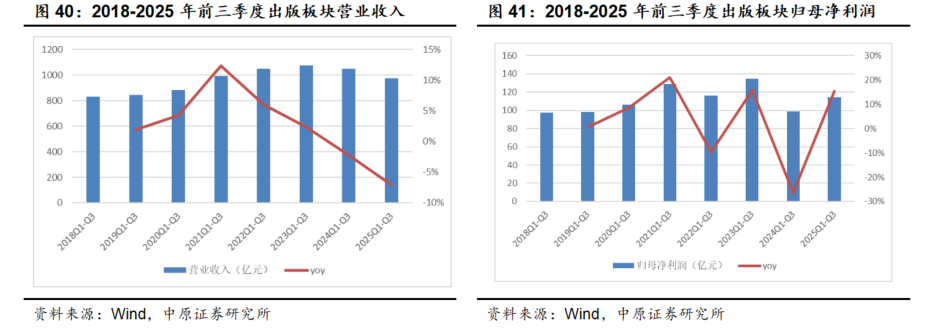 出版板块2025年前三季度营业收入976.00亿元,同比减少7.10%,归母净利润114.21亿元,同比增加15.43%;第三季度营业收入311.29亿元,同比减少4.67%,归母净利润26.38亿元,同比增加4.17%。