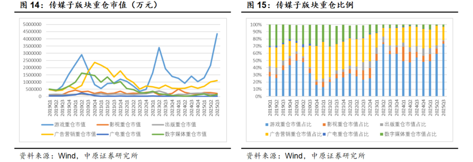 根据Wind基于基金定期报告披露的前十大重仓股统计数据,以申万一级行业分类为标准,剔除H股后,2025Q3公募基金对传媒板块重仓持股总市值593.94亿元,环比2025Q2增加了230.53亿元,增幅63.43%。2025年以来公募基金已经连续3个季度大幅增持传媒板块,并且当前公募基金对板块的重仓市值达到2019年以来的第二高,仅略低于2020Q2的609.09亿元。当前传媒板块重仓市值/基金重仓市值比重达到1.78%,环比提升0.38pct,也达到2021Q1以来的季度最高水平。