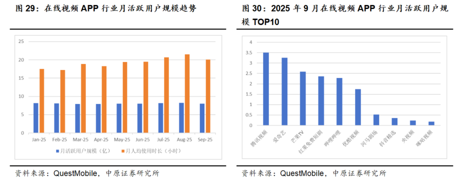 在视频平台端,根据QuestMobile数据,截至2025年9月,在线视频平台月活跃用户7.99亿,同比增长3.1%,月人均使用时长20.1小时,同比增长21.08%。其中腾讯视频、爱奇艺、芒果TV的月活跃用户规模排名TOP3,但从月活跃用户变化情况来看,腾讯视频和爱奇艺分别同比减少7.16%和9.72%,芒果TV同比增加0.39%,红果免费短剧和河马剧场依靠微短剧的热度用户活跃度分别同比增长93.9%和99.4%。