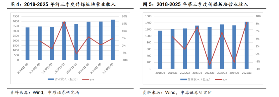 根据Wind统计(均采用加总值或加总平均值),2025年前三季度传媒板块140家上市公司总体营业收入为4160.65亿元,同比增加4.98%,归母净利润328.91亿元,同比增加40.23%,扣非后归母净利润273.98亿元,同比增加36.13%。其中Q3单季度营业收入1431.78亿元,同比增加8.41%,归母净利润106.17亿元,同比增加44.74%,扣非后归母净利润85.44亿元,同比增加75.72%。