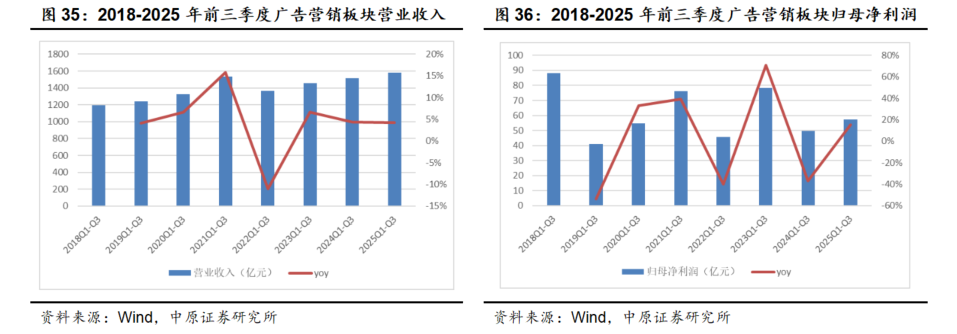 广告营销板块2025Q1-Q3营业收入1581.70亿元,同比增加4.25%,归母净利润57.16亿元,同比增加15.28%。广告营销板块在整体的营业收入端达到历年同期新高,归母净利润同比回升。
