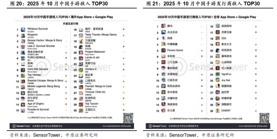 根据SensorTower数据,《Whiteout Survival》《Kingshot》《Gossip Harbor:Merge & Story》《Last War: Survival》《PUBG MOBILE》《原神》《崩坏:星穹铁道》《使命召唤手游》等国产手游产品构成了游戏出海的核心,形成了“大型厂商+中小厂商、长线老游戏+新游戏、中重度+轻度”齐头并进的出海格局。在手游产品之外,以《黑神话:悟空》为典型的高端国产3A主机、PC游戏在海外也广受欢迎,在实现商业价值之外也提高了中华文化在海外的影响力。