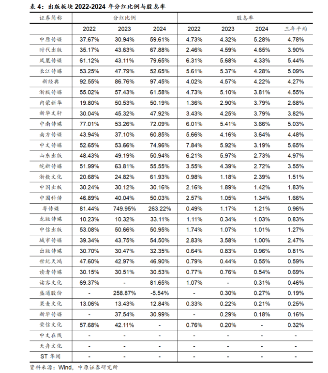 以2024年末为基准,中原传媒股息率超5%,时代出版、凤凰传媒、长江传媒、新经典股息率超4%,浙版传媒、内蒙新华、新华文轩、中南传媒、南方传媒、中文传媒股息率超3%。以2022-2024年三年平均股息率为标准,中文传媒、凤凰传媒、长江传媒、中南传媒的股息率超5%,山东出版、中原传媒、浙版传媒、南方传媒、新经典股息率超4%。在当前央行定调采用适度宽松的货币政策环境下,利率持续下降,高股息公司的相对配置价值进一步凸显。