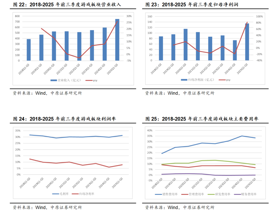 业绩层面,游戏板块2025年前三季度营业收入747.88亿元,同比增加25.92%,归母净利润134.75亿元,同比增加82.32%。2025年前三季度和第三季度,游戏板块的营业收入和归母净利润都实现了较大幅度的增长,且都以较大的优势达到历年同期的最高点。