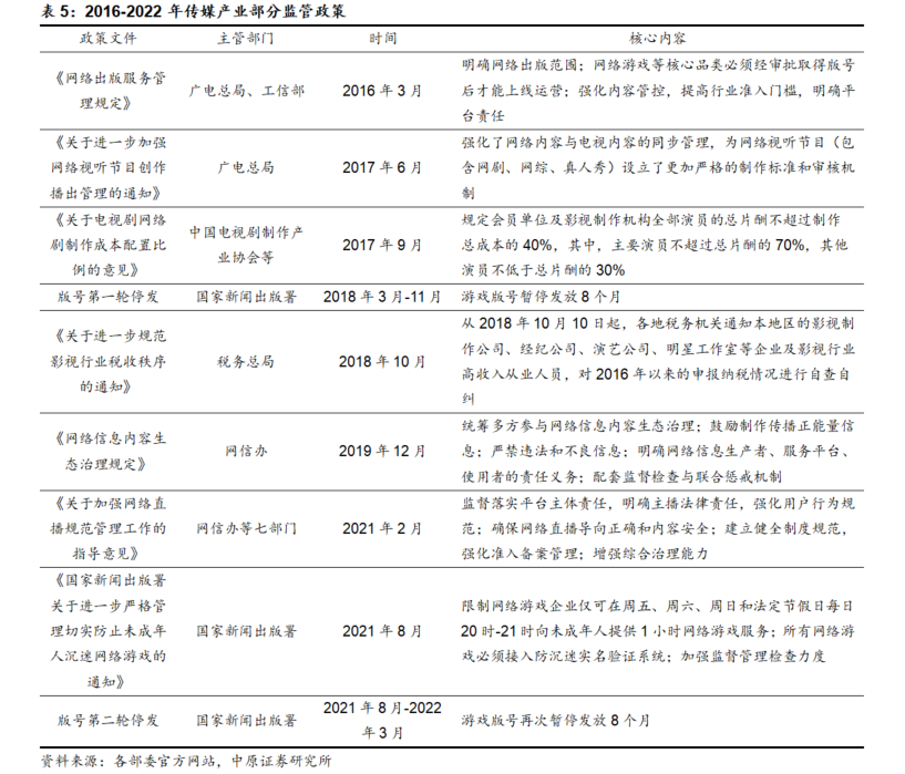 从过去产业的发展经历以及资本市场表现来看,不论是基于监管视角的政策还是基于扶持视角的政策都是影响行业的核心变量之一,会对国内传媒产业的发展和市场估值表现带来显著的影响。
