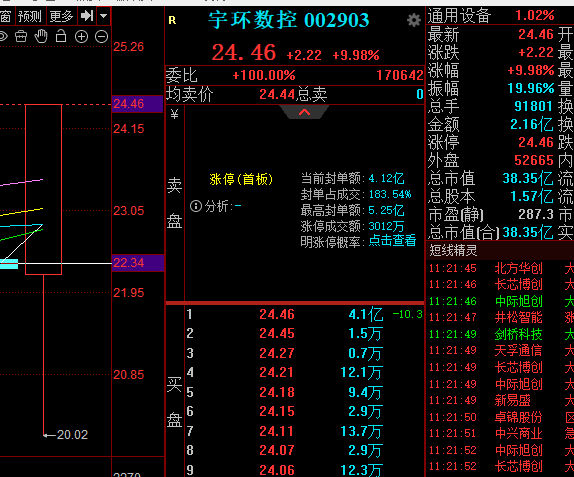 注:早间宇环数控股价曾触及跌停价20.02元。
