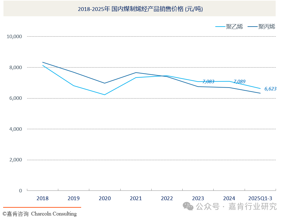 2018—2025年国内煤制烯烃产品平均出厂价格(元/吨)