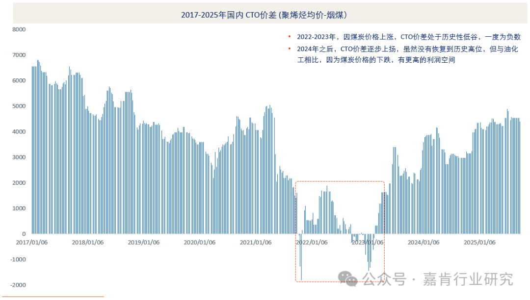 煤制烯烃业务与煤炭价格紧密相关。2022—2023年,因煤炭价格上涨,CTO价差处于历史性低谷,期间一度为负数,严重影响着煤制烯烃产品的毛利率。