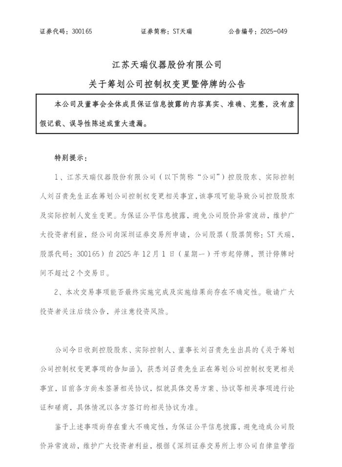 12月1日早间,ST天瑞(300165.SZ)在巨潮资讯网发布公告称,控股股东、实际控制人刘召贵正在筹划公司控制权变更相关事宜。公司股票自2025年12月1日开市起停牌,预计停牌时间不超过2个交易日。