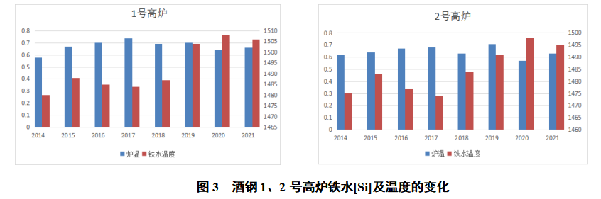 高炉生产需要长期稳定顺行,炉缸的活跃性至关重要,炉缸活跃性和热制度之间的关系就是渣铁流动性能。热制度的控制也就是对炉温的控制,即对铁水物理热和化学热的把握。酒钢高炉品位低,入炉硫负荷较高,加上有害元素含量高,渣量大(理论渣比475kg/t左右),对炉缸的热量要求更高。之前也曾采用低硅冶炼,但是物理热上不去,炉缸工作不好,炉况波动频繁。之后逐步提高炉温控制水平,提高铁水物理热,目前双高炉炉温控制水平0.60%左右,铁水物理热能够达到1480℃以上,炉缸的工作状态得到明显好转。