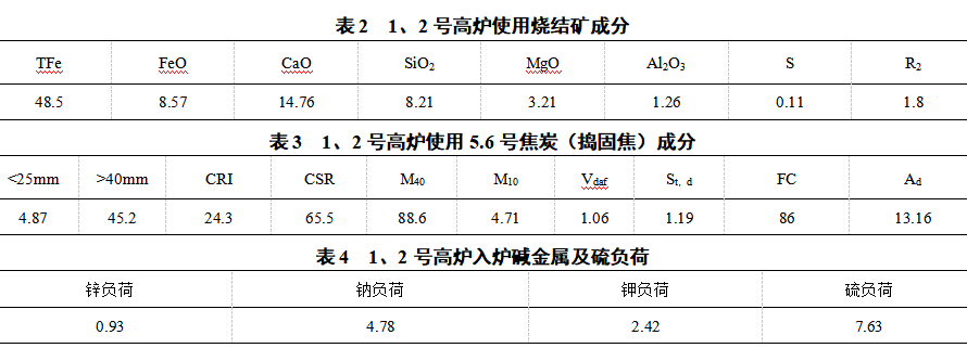 1、2号高炉都是料车上料,正常的生产批重1号高炉在39t左右,2号高炉在28.5t左右,均为三车制。炉料结构为烧结矿+球团+块矿,比例结构为60%-65%烧结矿,35-30%球团矿,5%左右国内块矿。双高炉均在矿石配加粒度12mm焦丁,焦丁比在30kg/t左右。