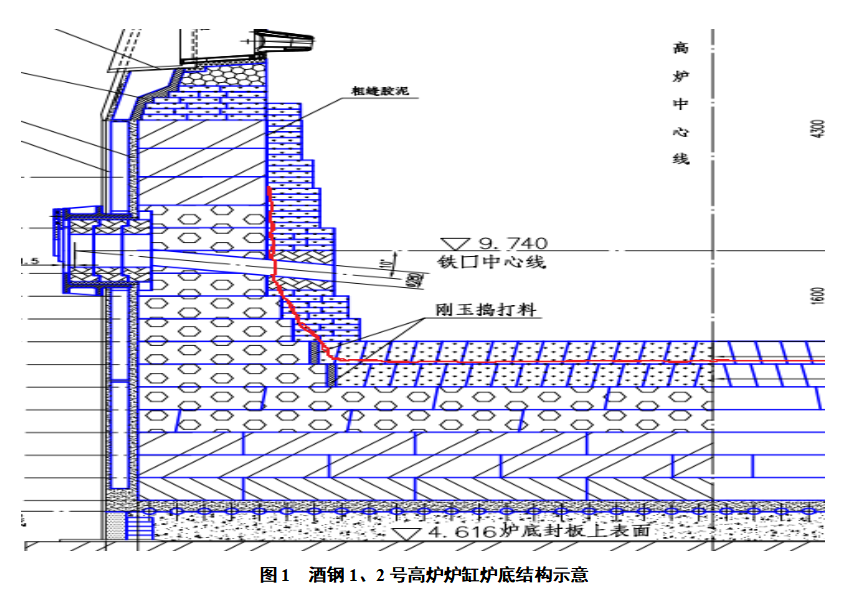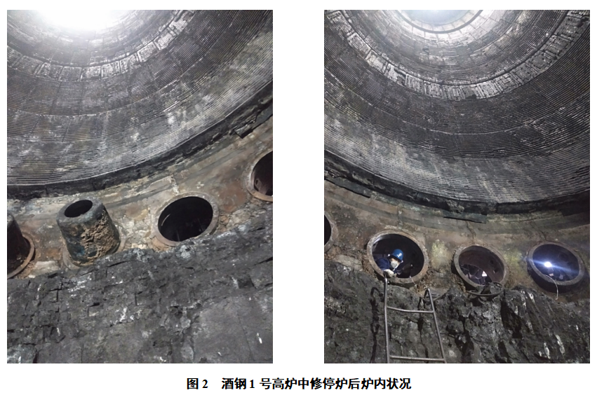 酒钢1、2号高炉是改造型大修,在原来的位置对高炉本体拆除后新建,框架和炉顶设备利旧,高炉煤气净化除尘由双文湿法除尘改为干法布袋除尘,渣处理由火渣改为热转鼓法渣处理系统,同时对其他系统进行改造建设。其中1号高炉(1800m3)设计26个风口和2个铁口,2号高炉(1000m3)设计18个风口和2个铁口,双高炉分别于2013年4月、8月开炉,目前已经生产已经超过8年,炉体整体状况良好。