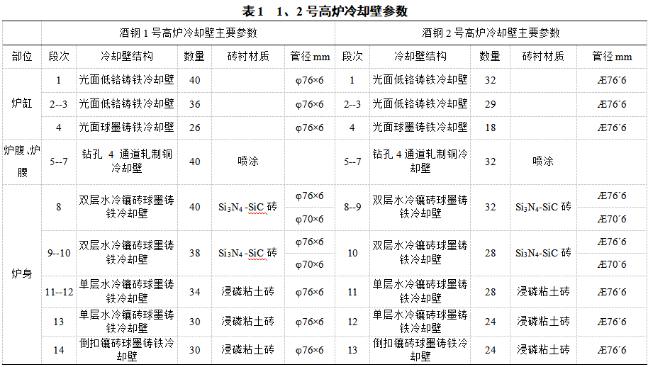 酒钢1、2号高炉由中冶南方工程技术有限公司设计,采用全冷却壁结构,冷却壁由炉底延伸至炉喉缸砖下沿,并且在不同的部位采用不同的材质和不同的结构类型(见表1)。