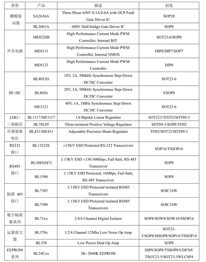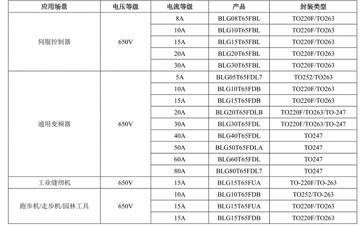 上海贝岭针对伺服控制器、通用变频器、工业缝纫机、跑步机、通用风机、园林工具等应用设计有多条650V IGBT产品线,涵盖电流等级8A-80A器件,欢迎垂询!具体型号参考表1。在高压伺服驱动器中,除了核心的功率器件,高效可靠的电源管理和信号处理芯片同样是确保系统稳定、可靠运行的关键,上海贝岭可提供电机控制相关的完整配套解决方案,具体型号参考表2。