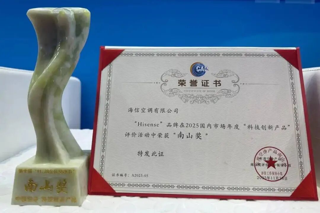 11月28日,第十届“ 全民空净节”暨“南山奖”颁奖盛典在广州举办,海信空调连续四年斩获“南山奖”,成为唯一获此殊荣的空调品牌。其中,海信新风空调X7Pro凭借双向流换新风、360°控风系统等技术突破,荣膺“南山奖”科技创新产品殊荣;海信空调有限公司被评为2025年度“诚信、品牌、质量、管理、服务”AAAAA企业。