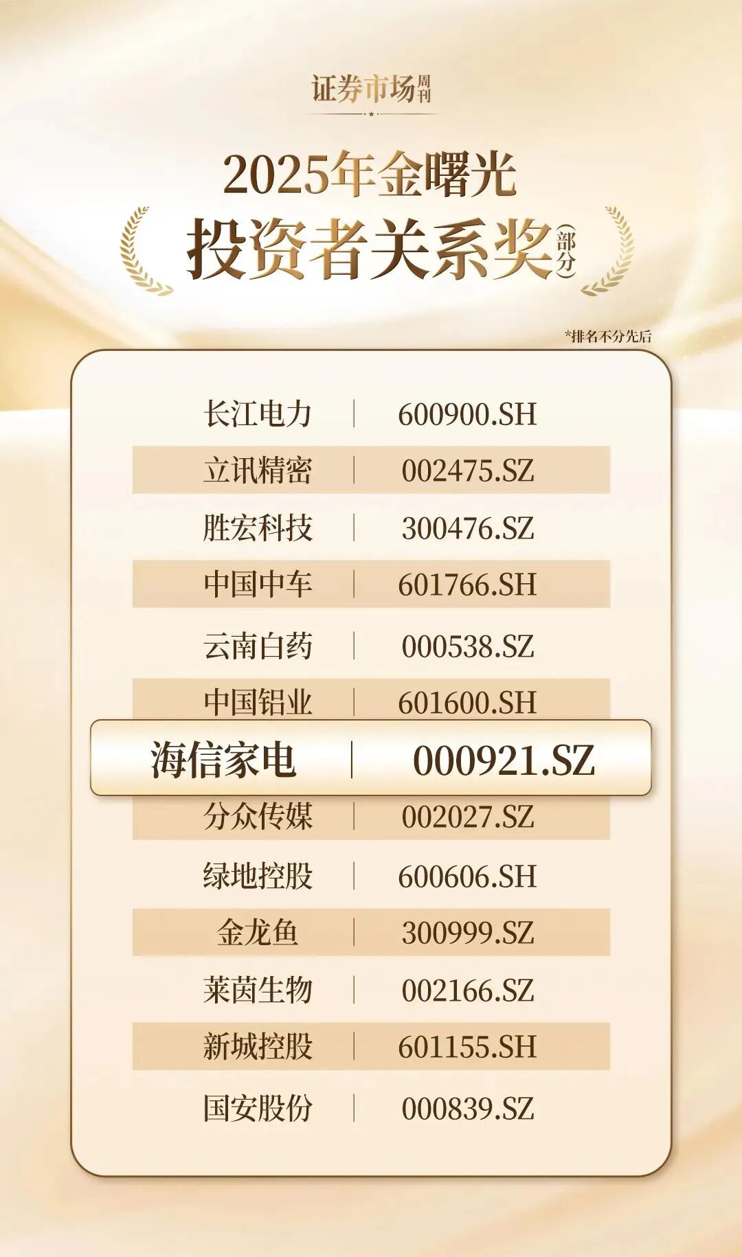 海信家电荣膺2025年金曙光投资者关系奖(点击查看)
