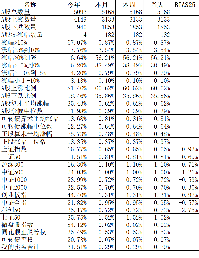 3133只个股上涨、1853只个股下跌,涨幅中位数0.39%。