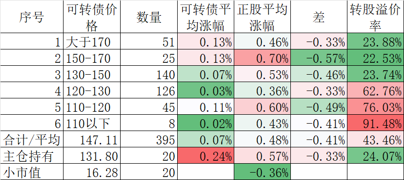 395只可转债平均上涨0.07%,对应正股平均上涨0.48%。我的20只可转债平均上涨0.24%,对应正股平均上涨0.57%。