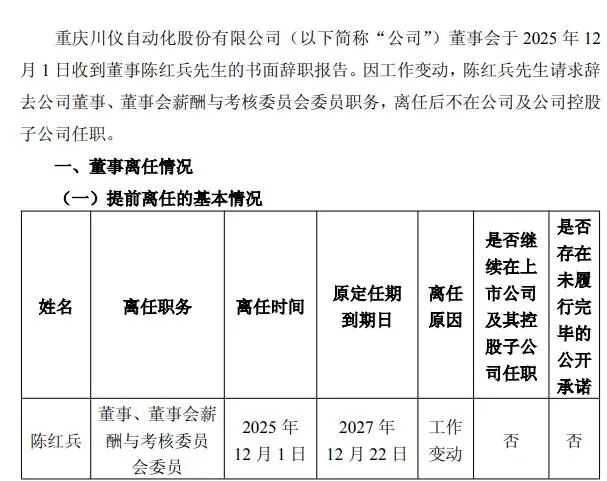 12月1日,川仪股份(证券代码:603100)发布公告称,因工作变动,陈红兵请求辞去公司董事、董事会薪酬与考核委员会委员职务,离任后不在公司及公司控股子公司任职。原定任期到期日2027年12月22日。