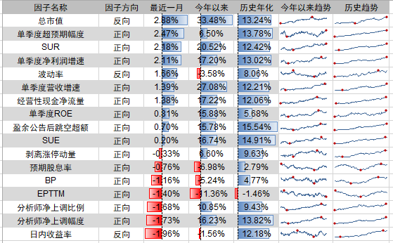 今年以来,总市值、单季度营收增速、SUR表现较好,EPTTM、预期股息率、BP表现较差。