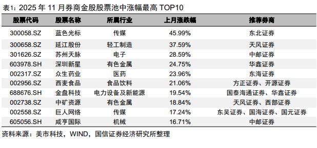 2025年11月,蓝色光标、延江股份、苏州天脉等券商金股股票的月度上涨幅度靠前。