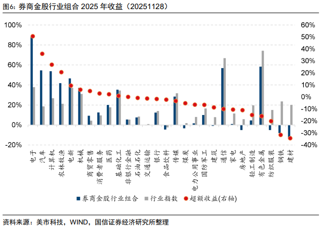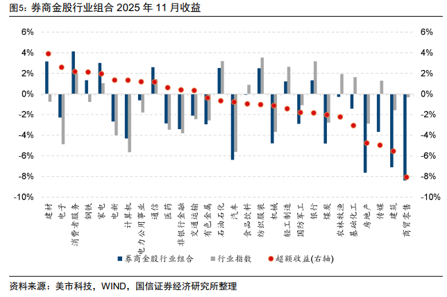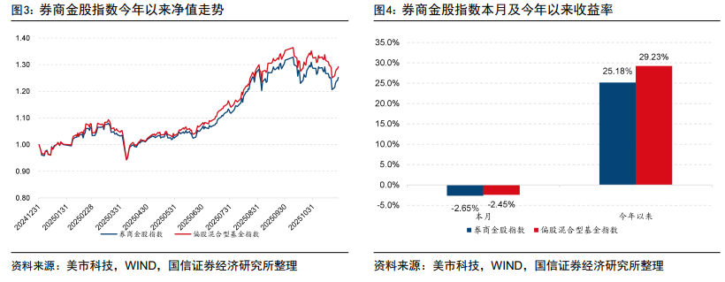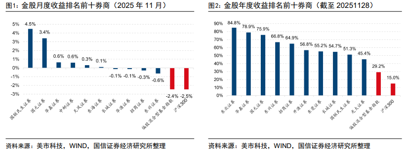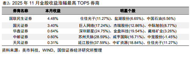 2025年11月,国联民生证券、国元证券、华鑫证券收益排名前三,月度收益分别为4.48%、3.40%、0.64%,同期偏股混合型基金指数收益-2.45%,沪深300指数收益-2.46%。