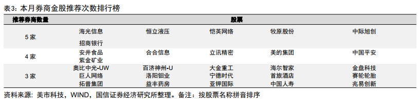 在券商金股股票池中,多人推荐的股票往往能够获得更高的市场关注度。表3展示了本月券商金股推荐次数排行榜,其中海光信息、恒立液压、恺英网络等均有5家以上分析师推荐;安井食品、合合信息、立讯精密等有4家分析师推荐;奥比中光-UW、百济神州-U、大金重工等有3家分析师推荐。