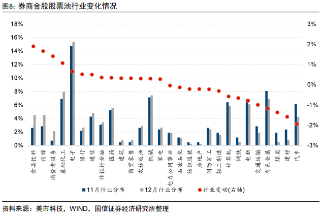 根据我们的统计,截至2025年12月1日,共有41家券商发布本月金股。在对券商金股股票池进行去重后,总共有264只A股。我们对券商金股在中信一级行业上的权重分布及变化情况进行分析,其结果如图8所示。具体来看