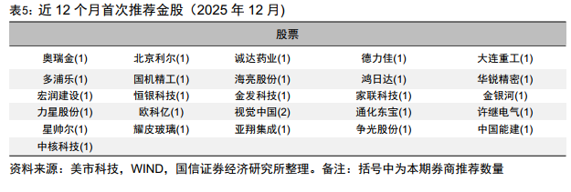 从卖方视角来看,如果某只股票在最近12个月均未被任何券商分析师推荐为金股,那么说明其在券商分析师这一群体中受到的关注相对较少。表5展示了本月金股中,属于近12个月以来首次出现在券商金股股票池中的样本。