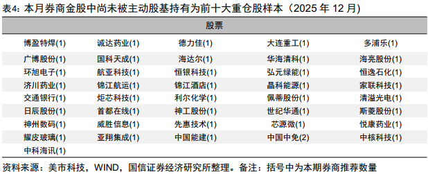 从买方关注度视角来看,如果一只股票尚未被任何一只主动股基持有为前十大重仓股,说明其在公募基金经理这一群体中的关注度有待提升。我们获取本月券商金股股票池中,尚未被任何一只主动股基在最近一个季报中持有为前十大重仓股的样本,其结果如表4所示。